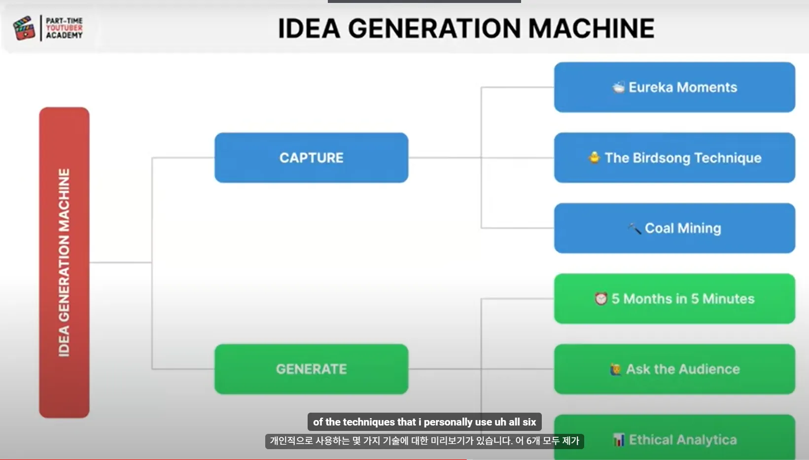 유튜브 영상이나 글에 대한 아이디어를 생성할 때 David Perell이 활용하는 ‘Idea Factory’ 와 Ali Abdaal이 활용하는 Idea Generate Machine에 대한 설명을 담은 영상이다.