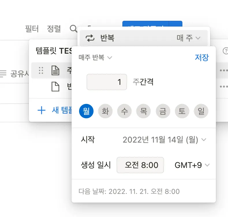 주의 : 반복의 시작을 “오늘”로 저장해도, “내일”로 저장되는 오류가 있네요, 작동이 안되면, 시작 시간이 오늘부터인지 확인하세요. (체크중)