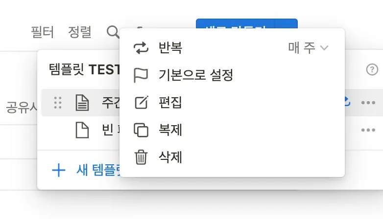 템플릿 목록에서 만들어진 템플릿의 [점 3개] 클릭