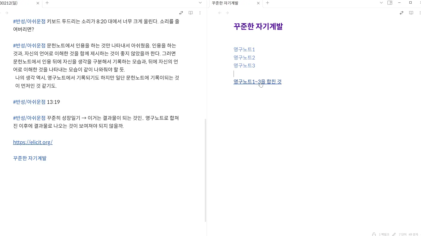 - ‘꾸준히 성장일기’라는 글 = 활용 단계에서 결과물. 맨 처음에 문제 의식에 대한 영구노트가 있고 (키워드 노트), 그 노트를 바탕으로 글쓰기가 보여주면 좋음. 만든 3개의 메모를 조합해서 “어떻게 꾸준히 자기계발할 수 있는가?”라는 질문에 답해야 함. 메모를 만들던지, 꾸준한 자기계발이라는 제목으로 영구노트를 하나 만들던지, 3개의 영구보관용메모가 꾸준한 자기계발 노트 키워드 노트에 연결을 설명해야 함.